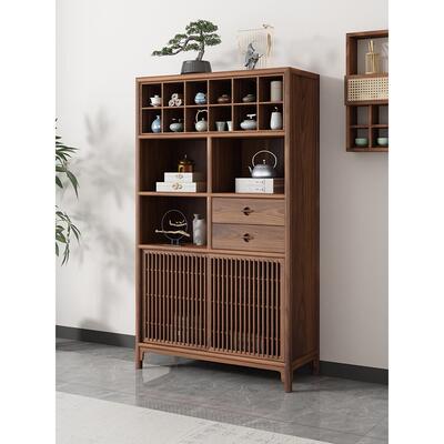 新中式多宝阁博古架置物架北美黑胡桃实木茶叶展示柜收纳茶室边柜