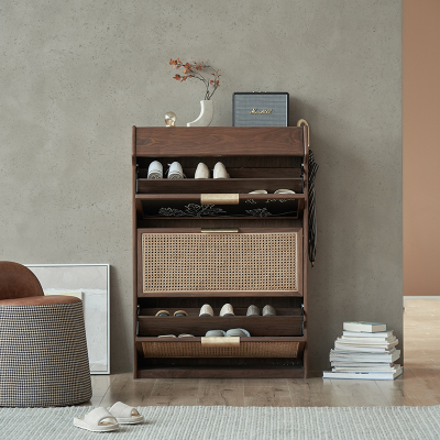 实木鞋柜家用门口小户型超薄翻斗鞋架北欧日式黑胡桃木藤编玄关柜