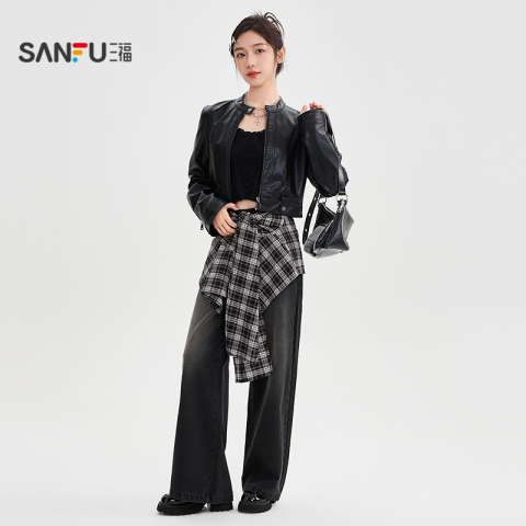 三福牛仔裤2025新款秋季设计感可拆搭片宽松直筒阔腿裤女装504875