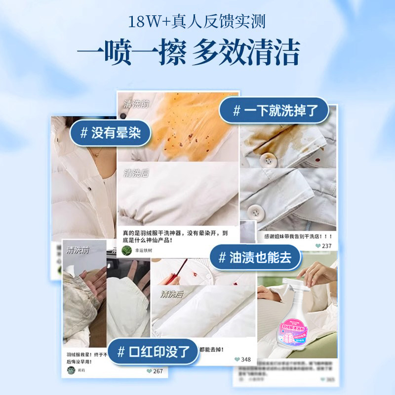【收到货后好.评反现红.包2元】细腻渗入,强劲去污。富含表面活性剂、去污因子,让衣物保持蓬松/洁净。免水洗更高效,不留水痕。一喷一擦,羽绒服如初洁净。