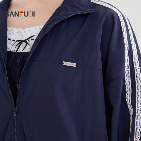 三福外套女2025新款秋季韩系杠条蕾丝宽松翻领蓝色上衣女装507601