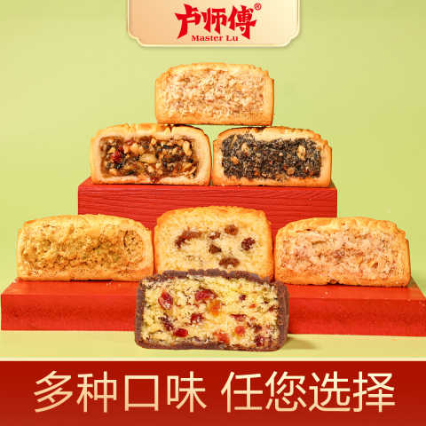中秋佳节,选卢师傅月饼,口味多,口感妙,品不同,五仁+黑芝麻,浓情搭配,酥皮惊喜,不试怎知好,巧蔓跃鲜,风味非凡必享