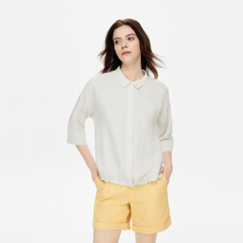 姐妹们,今天给大家推荐一款非常舒适的七分袖衬衫,是这种经典的翻领设计,而且它的面料是再生纤维素纤维和亚麻的混纺,非常吸湿透气,穿上之后呢,会有一种非常自然的舒适感。而且它这个面料摸上去的手感非常好,就是那种非常柔软、亲肤的面料。而且这款衬衫还有一个非常大的特点,就是它的下摆内置可调节松紧抽绳设计,非常贴心,穿起来非常舒适。颜色方面,有海军蓝和茉莉白两种选择,适合春夏季节穿着。